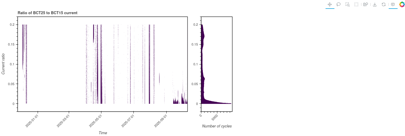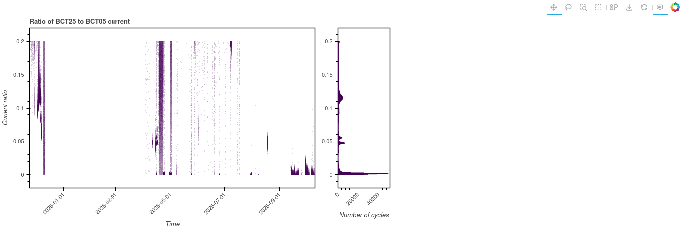 Here the ratio of BCT25 to BCT05 current values is displayed as a measure of the Linac3 transmission downstream of the LEBT